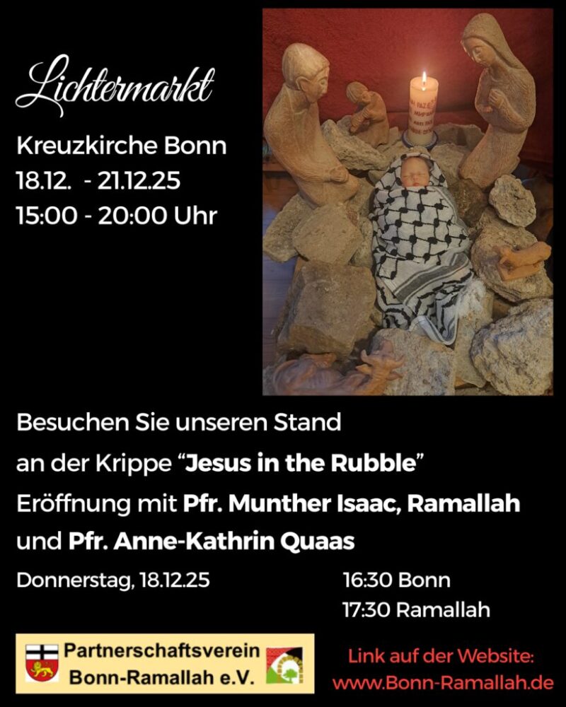 Am 18. Dezember um 16:30 Uhr werden wir gemeinsam mit Pfr. Munther Isaac aus Ramallah sowie Dr. Anne Kathrin Quaas, Leiterin des Evangelischen Forums, dieses besondere Ereignis feiern.